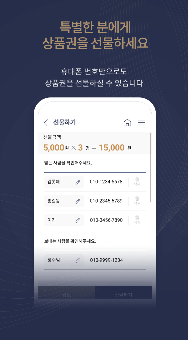 A. 앱 내 '선물하기' 기능을 이용하여 받는 사람의 정보를 입력하고 원하는 상품권을 선택한 후 전송하면 됩니다.