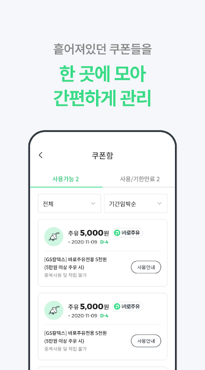 A. 앱 내 쿠폰관리 메뉴에서 원하는 쿠폰을 선택하여 사용할 수 있습니다. 주유 결제 시 쿠폰을 선택하면 자동으로 할인이 적용됩니다.