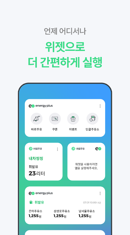 에너지플러스는 사용자에게 필요한 다양한 기능을 한눈에 제공하여, 주유 과정을 더욱 편리하게 만듭니다. 간편한 위젯 접근과 실시간 할인 정보 제공으로 사용자는 언제 어디서나 손쉽게 주유 결제를 할 수 있습니다. 주유소 추천 및 쿠폰 관리를 통해 더욱 효율적인 주유가 가능합니다. 이러한 통합된 기능들은 사용자 경험을 극대화하며, 주유를 보다 스마트하게 만들어 줍니다.