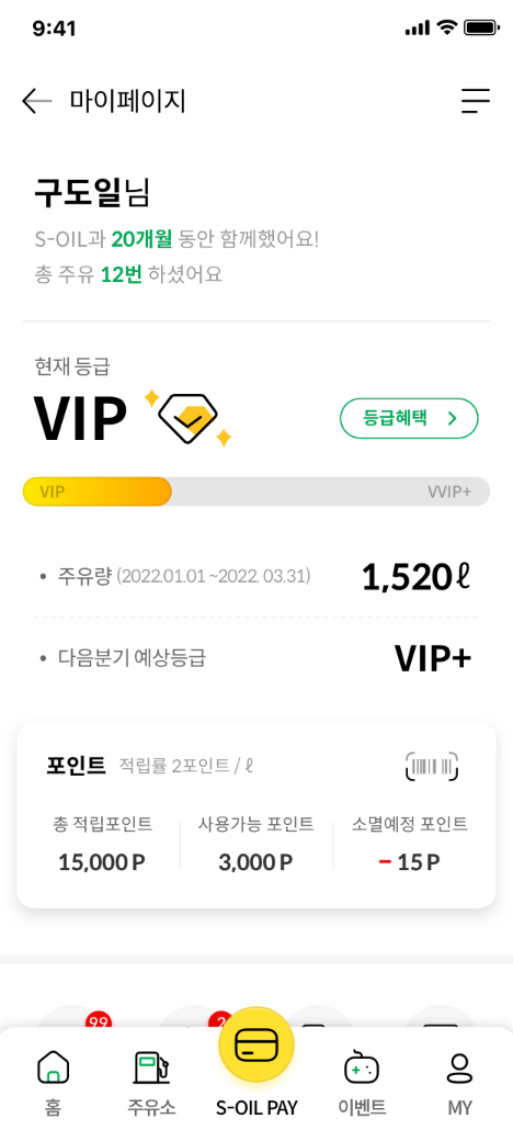 MY S-OIL 어플은 Silver, Gold, VIP, VIP+ 등급의 멤버십을 새롭게 도입하여, 등급에 따라 다양한 혜택을 제공합니다. Silver 등급부터 시작하여, 상위 등급으로 갈수록 더 많은 포인트를 적립할 수 있으며, 최대 리터당 4포인트까지 적립이 가능합니다.