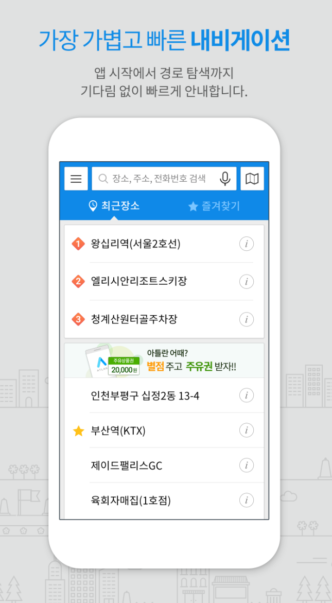 아틀란 내비게이션은 경로 탐색부터 앱 시작까지 가장 빠르고 가벼운 내비게이션을 제공합니다. 초보 운전자도 안전하고 편리하게 운전할 수 있도록 복잡한 도심의 초행길을 손쉽게 탐색할 수 있습니다. 승용차, 전기차, 바이크 등 모든 모빌리티에 맞춘 맞춤형 경로 안내를 통해 사용자에게 최적의 운전 경험을 선사합니다.