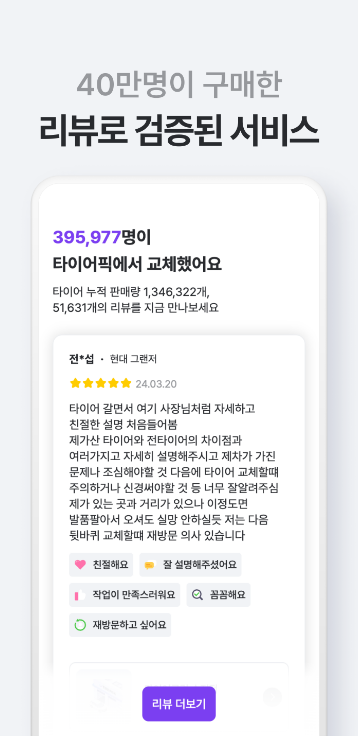 투명한 가격 정책과 편리한 예약 시스템을 통해 누구나 쉽게 이용할 수 있으며, 고객센터와 커뮤니티를 통해 지속적인 지원과 소통을 이어가고 있습니다. 타이어픽과 함께라면 차량 관리가 더욱 쉽고 효율적으로 변합니다. 지금 바로 앱을 내려받기하고 다양한 혜택을 누려보세요.