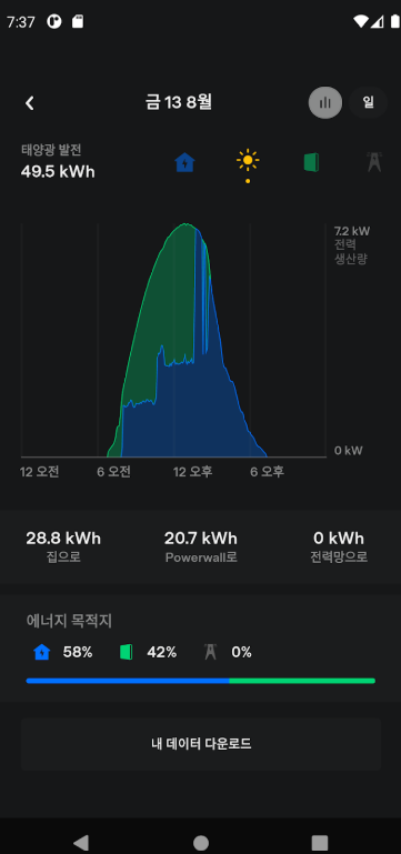 에너지 소비량과 생산량, 배터리 사용 현황 등 중요한 지표들을 한 눈에 볼 수 있으며, 이를 바탕으로 효율적인 에너지 전략을 수립할 수 있습니다. 이러한 통합 관리 시스템은 가정의 에너지 자립도를 높이고, 장기적으로 경제적인 에너지 운영에 기여합니다. 사용자는 데이터 다운로드 기능을 활용해 상세 분석 자료를 확보할 수 있어, 에너지 관리에 필요한 다양한 정보를 쉽게 얻을 수 있습니다.