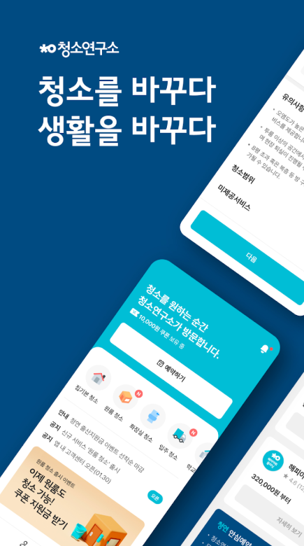 청소연구소 앱은 전문 매니저의 세밀한 접근과 최신 기술을 통해 생활 환경에 혁신적인 변화를 가져옵니다. 고객의 다양한 요구에 부응하는 맞춤형 옵션과 투명한 예약 시스템으로 누구나 쉽고 편리하게 이용할 수 있습니다.