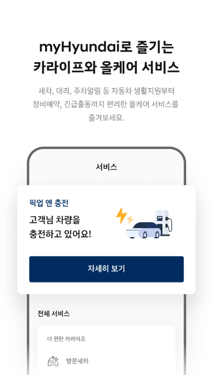 마이현대앱은 차량 관리부터 충전, 멤버십 혜택까지 제공하는 혁신적인 플랫폼으로, 현대차 오너들에게 새로운 차량 생활을 제시합니다. 차량 원격 제어, 정비 예약, 전기차 충전소 찾기 등 다양한 기능을 통해 차량과의 연결을 더욱 스마트하고 편리하게 만들어 줍니다. 이 앱을 통해 고객은 보다 효율적인 차량 관리를 경험할 수 있습니다.