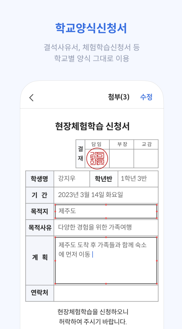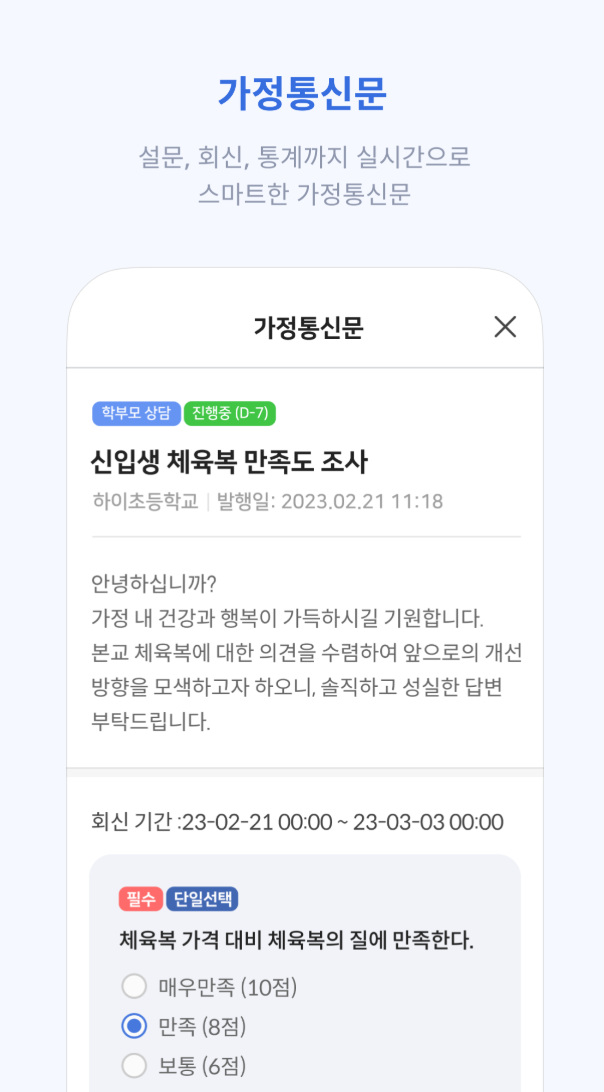 하이클래스는 학부모와의 소통을 강화하기 위한 다양한 기능을 제공하며, 가정통신문이나 설문을 모바일로 간편하게 확인하고, 전자 서명으로 쉽게 제출할 수 있습니다. 이를 통해 학부모는 언제든지 중요한 정보를 빠르게 받아볼 수 있습니다.