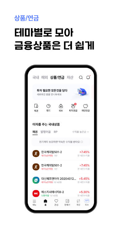 한국투자증권 앱은 주식 거래 외에도 다양한 금융 상품을 제공합니다. ETF, 펀드, 채권, 연금 상품 등 여러 옵션을 손쉽게 거래할 수 있어 투자자가 다양한 전략을 통해 자산을 관리할 수 있습니다.