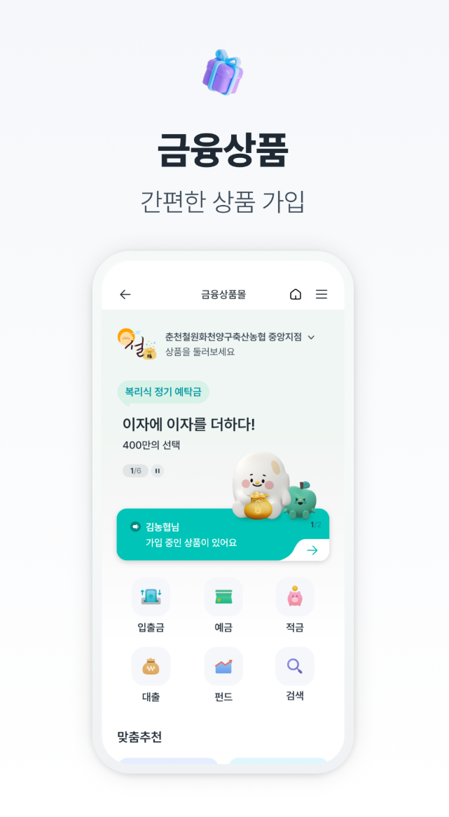 농협 NH올원뱅크 앱은 다양한 금융 상품을 제공합니다. 예적금, 대출, 외환, 펀드 등 다양한 상품을 모바일 앱을 통해 편리하게 검색하고 가입할 수 있습니다. 특히, 복잡한 투자 상품도 간편한 가입 절차를 통해 쉽게 이용할 수 있습니다.