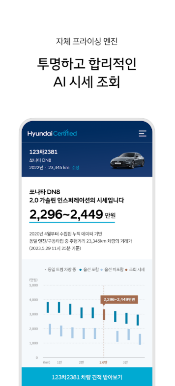 현대 인증중고차는 AI 프라이싱 엔진을 통해 정확하고 투명한 시세 제공을 보장합니다. 고객은 빅데이터 기반의 세세한 옵션 단위별 시세를 경험할 수 있습니다. 이로 인해, 중고차 가격에 대한 불확실성을 없애고 공정한 거래를 보장합니다.