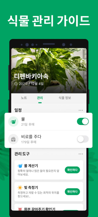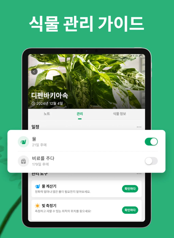 관리에 필요한 모든 팁을 맞춤형으로 제공합니다. 물 주기, 비료 주기, 최적의 빛 조건 등 세심한 관리 조언을 통해 식물들이 건강하게 자랄 수 있도록 돕습니다.