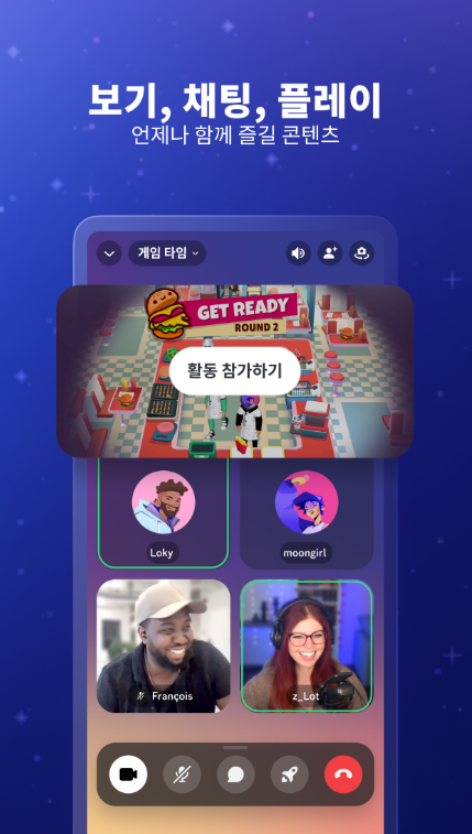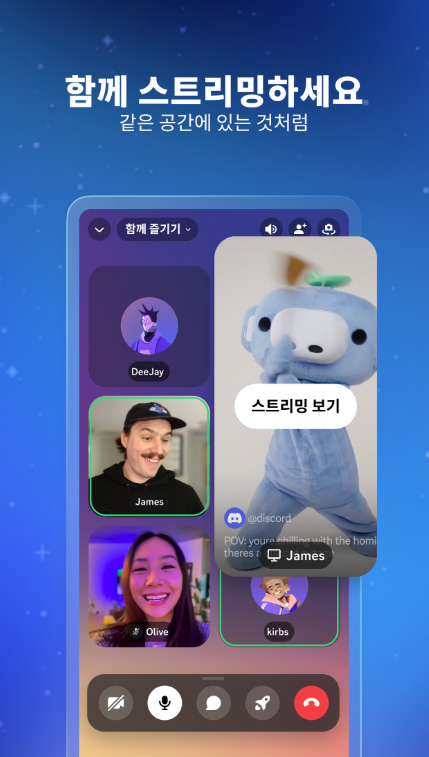 디스코드 앱은 고품질, 저지연 방송 기능을 제공하여, 게임을 하거나 쇼를 시청할 때 마치 같은 공간에 있는 것처럼 함께 시간을 보낼 수 있는 환경을 만들어 줍니다.