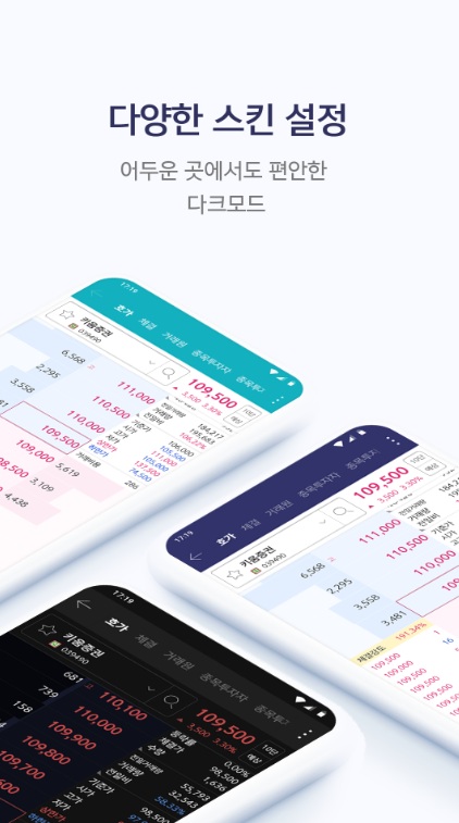 키움증권 앱은 어두운 곳에서도 편리하게 사용할 수 있는 다크모드를 제공합니다. 개인에 맞는 스킨 설정을 통해 편리하게 앱을 이용할 수 있습니다.