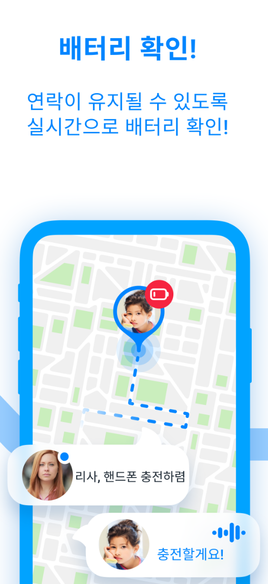 앱 실행 후 대시보드에서 자녀의 현재 위치와 이동 경로를 한눈에 확인하세요. 배터리 잔량 알림을 설정해 기기가 꺼질 걱정을 줄이고, 위치 기록을 통해 하루 방문 장소 목록도 열람할 수 있습니다. 채팅 기능으로 메시지, 음성, 스티커를 주고받아 자연스럽게 소통하며, 위급 시 SOS 버튼을 눌러 즉시 부모 앱에 알림을 전송합니다.
