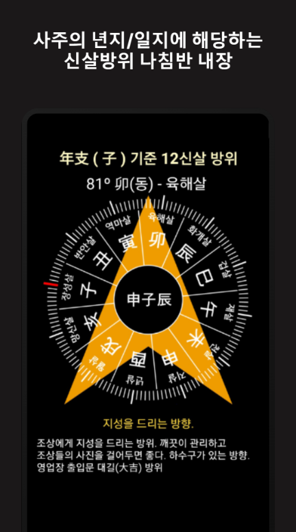 앱의 상단에는 연·월·일·시 정보가, 중간에는 간지와 오행, 하단에는 신살 목록이 표시됩니다. 각 요소를 터치하면 세부 팝업이 활성화됩니다. 일진 달력은 달력 아이콘을 눌러 월별 운세를 쉽게 조회하는 기능입니다. 나침반 기능으로 12신살 방위를 실시간으로 확인할 수 있습니다.