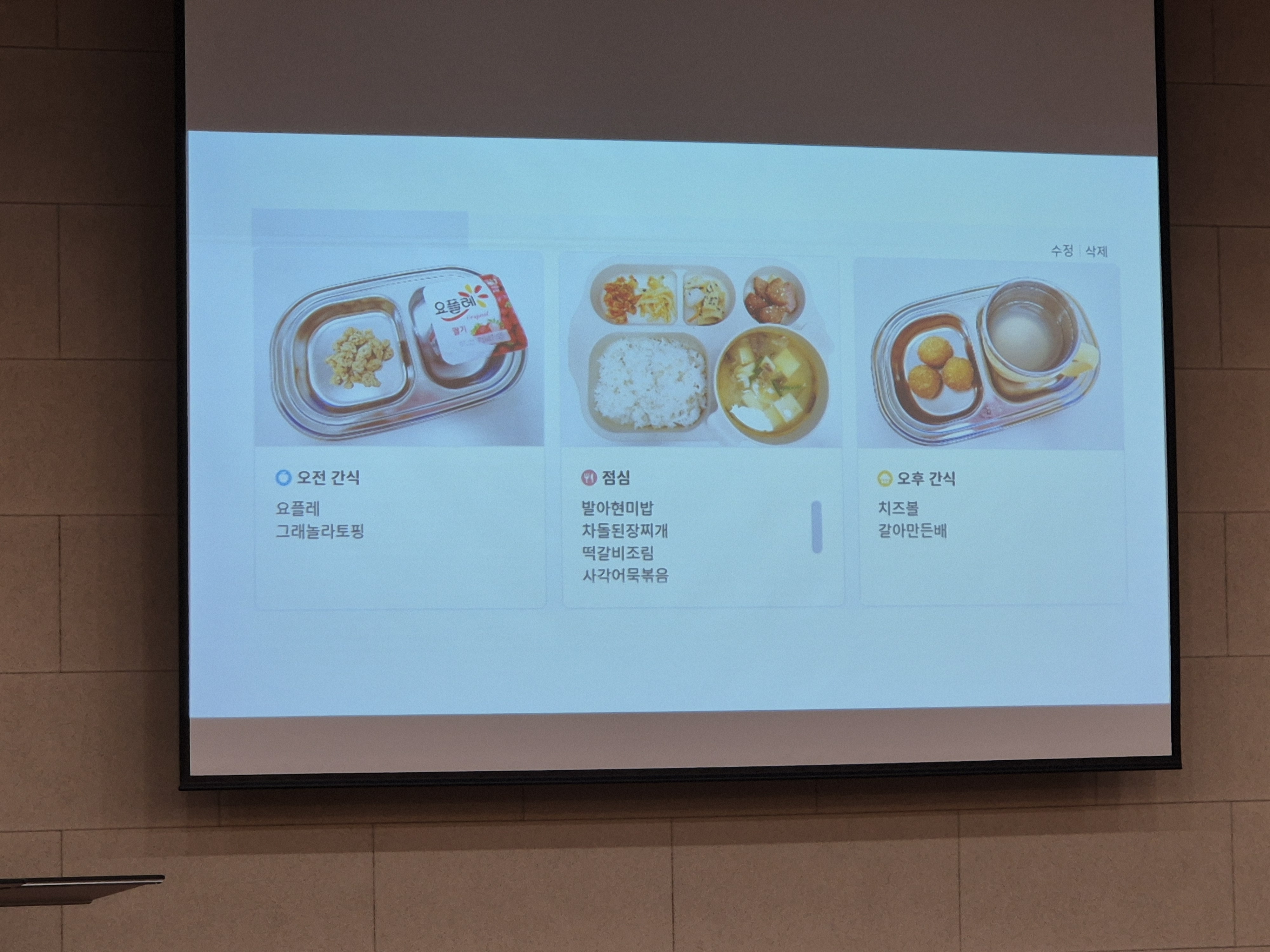 메뉴들입니다. 1식 4찬 제공합니다. 이것저것 많이 주네요. 간식은 간단간단하게 나옵니다.