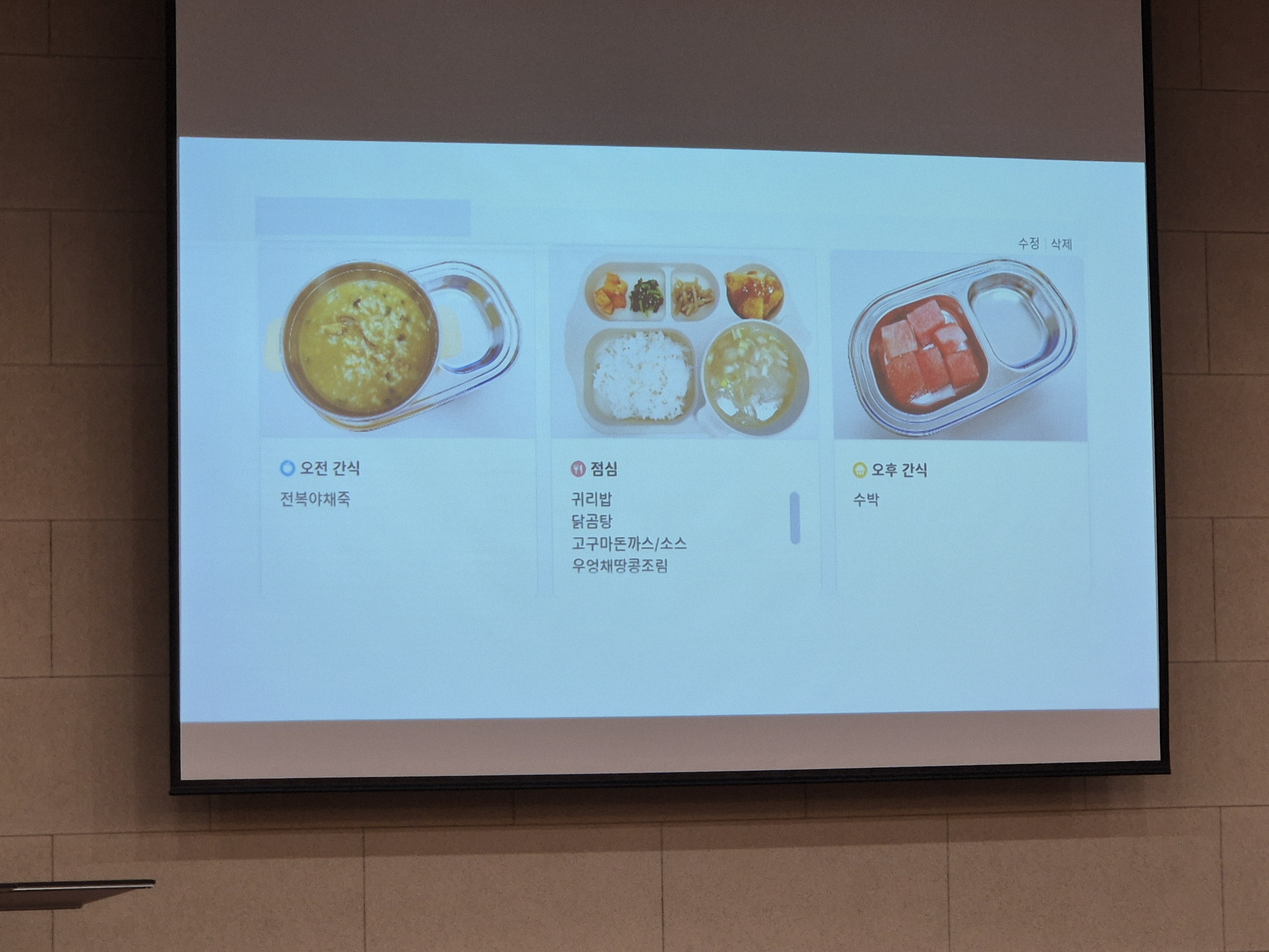 식사 안내사항입니다. 총 3번 제공되며 한식입니다. 오전간식, 점심, 오후간식 3차례 줍니다.