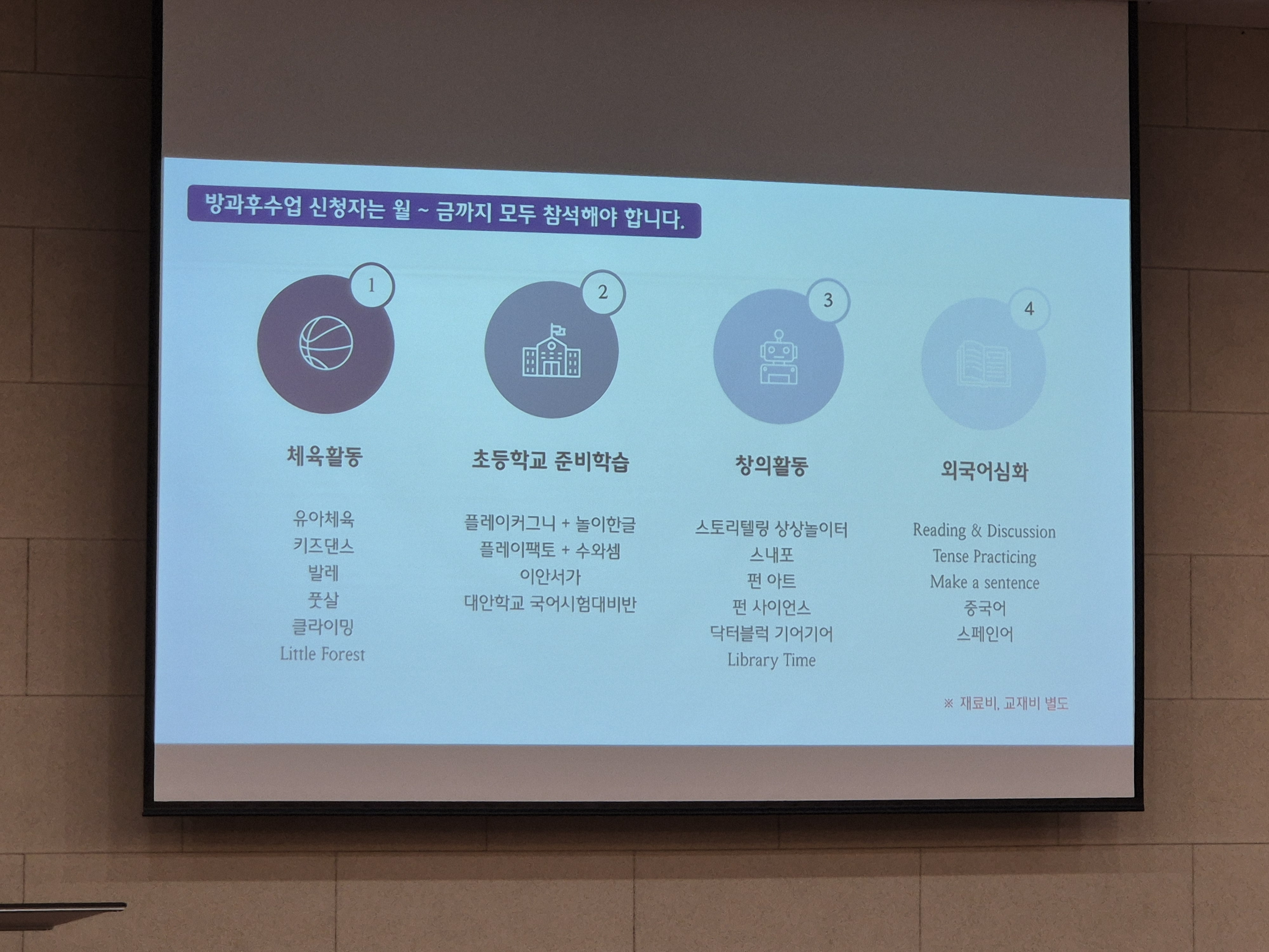 방과 후 수업 관련 안내 사항입니다. 엄청 다양합니다. 댄스, 발레, 풋살, 클라이밍, 한글, 산수, 국어시험대비 ,펀아트, 중국어 스페인어 등등 많이 합니다.