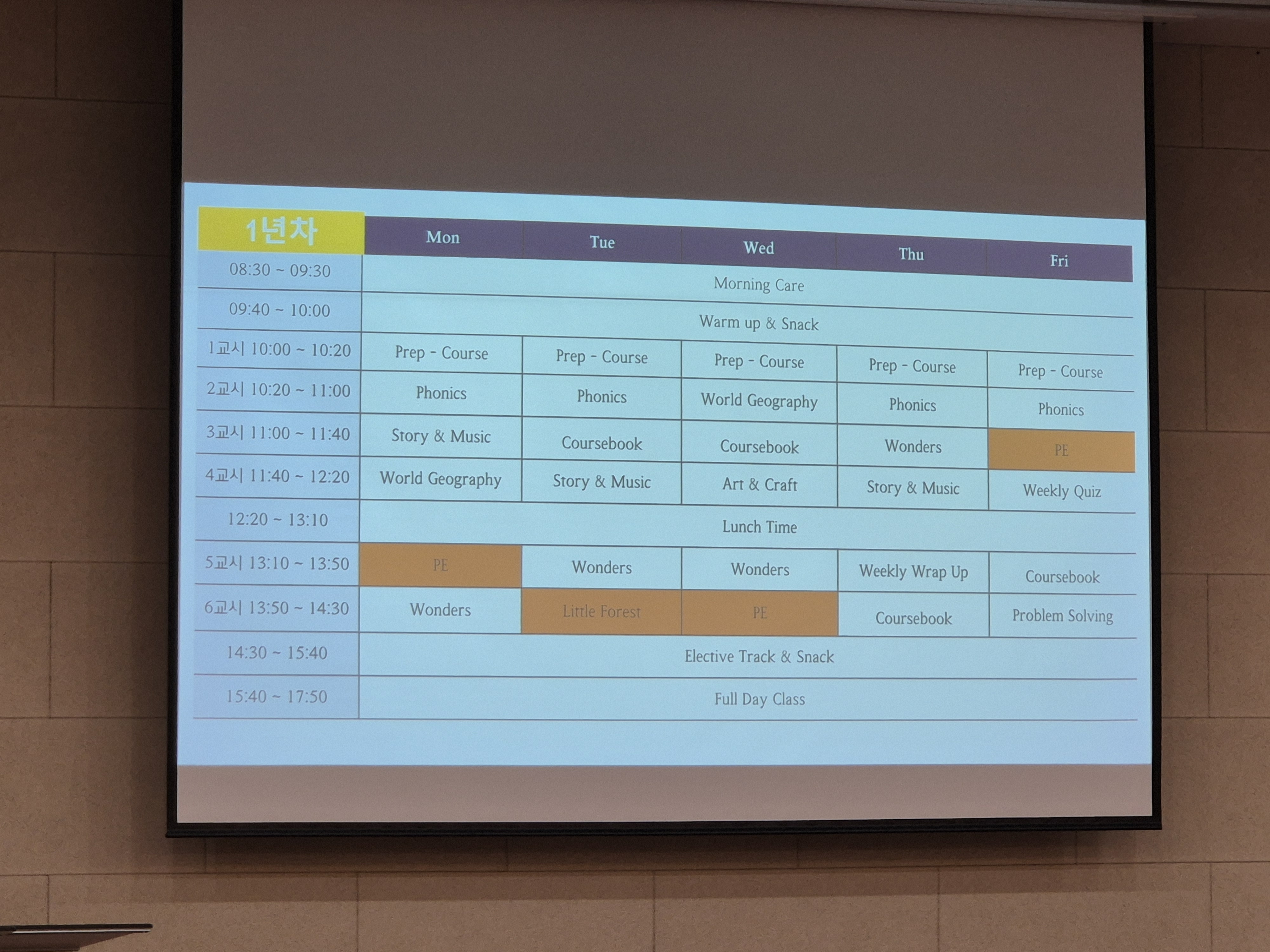 정규 시간표 입니다. 저기 색칠 되어있는 부분이 체육활동입니다. 1주일에 4회 진행된다고 합니다.