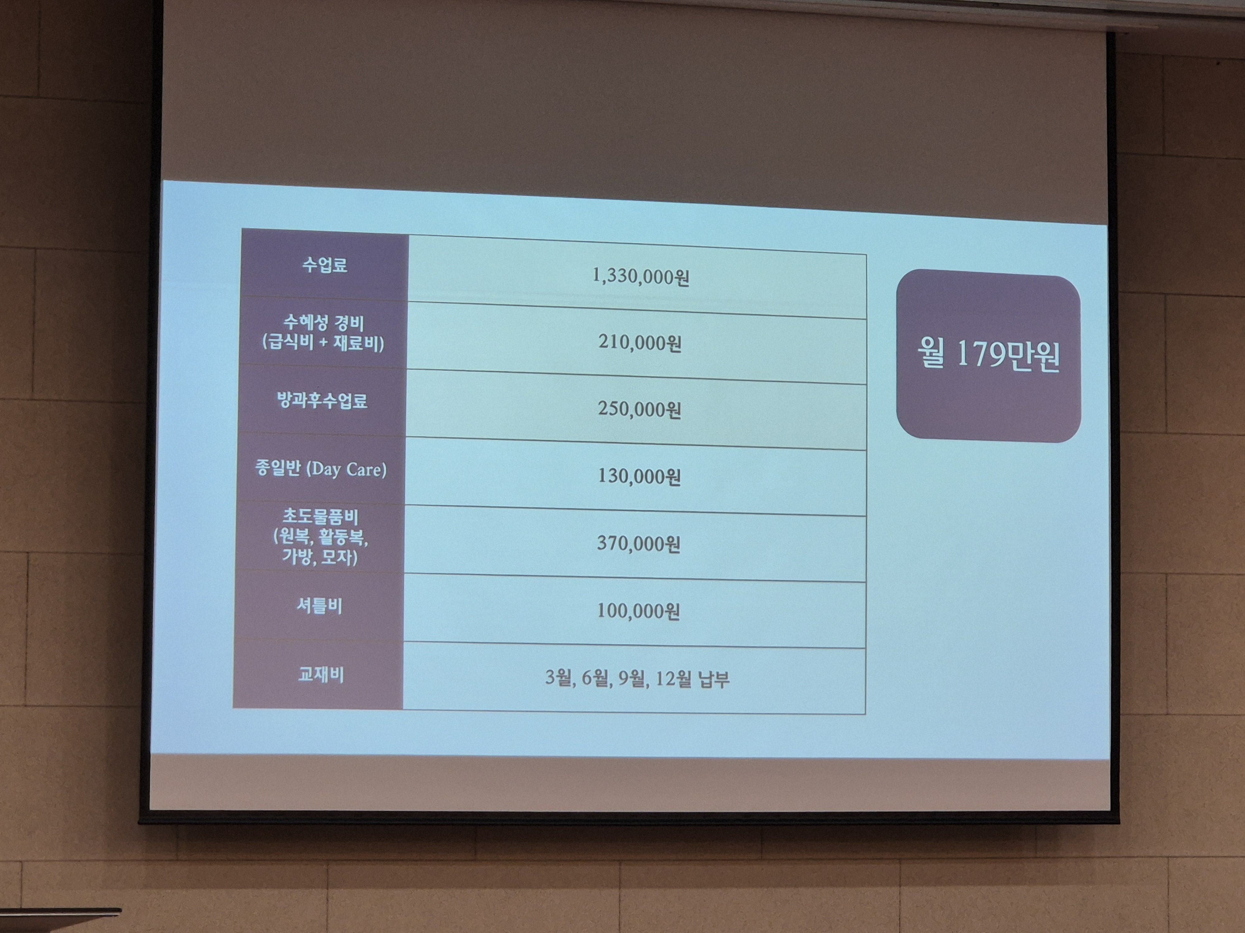 대충 월 179만원 플러스 알파입니다. 수업료 + 식비 + 방과후 수업료 + 셔틀비 + 종일반 다하면 200만원 이상 든다고 생각하면 될 거 같습니다.